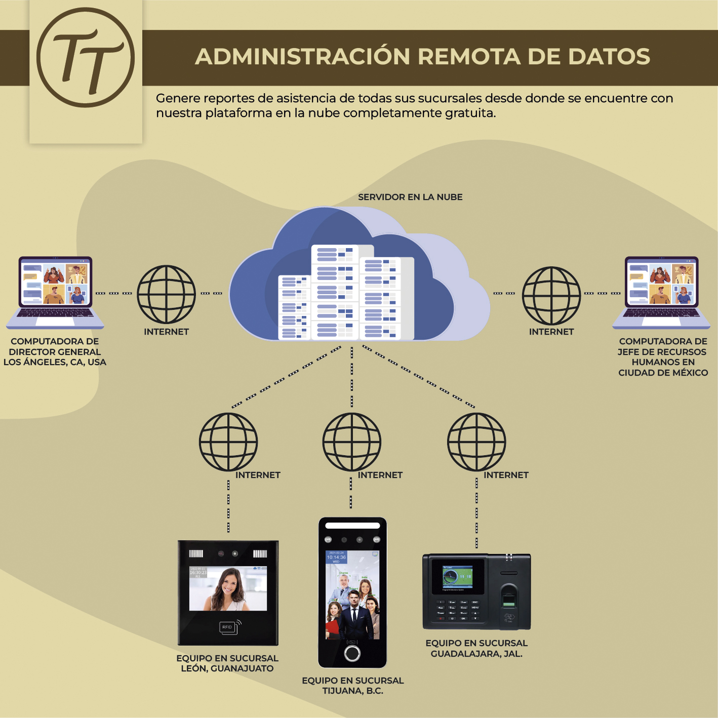 Los dispositivos de la línea "Tiempo y Tecnología Online" están equipados con un sistema de administración en la nube sin costo adicional. Este sistema te permite gestionar la información de los dispositivos de forma remota y generar informes de hasta 3 meses.
