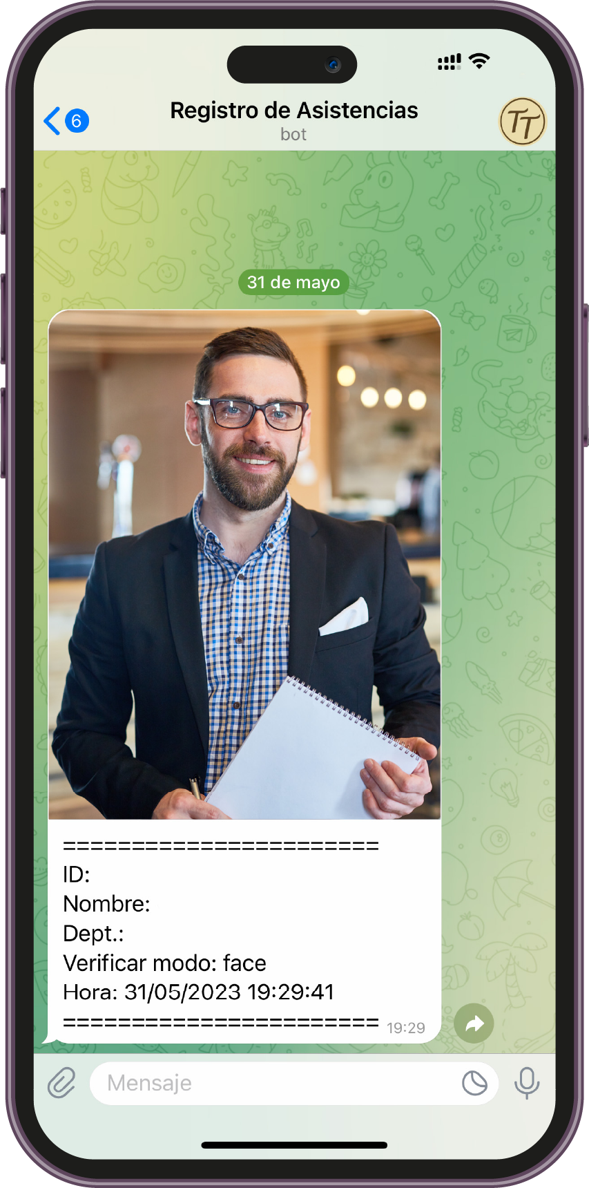 Éste equipo cuenta con una funcionalidad de hacer llegar vía Telegram al jefe de recursos humanos o hasta 20 personas designadas, notificaciones con el nombre del empleado, departamento, método de verificación, fecha y hora así como una fotografía del registro en tiempo real del empleado.